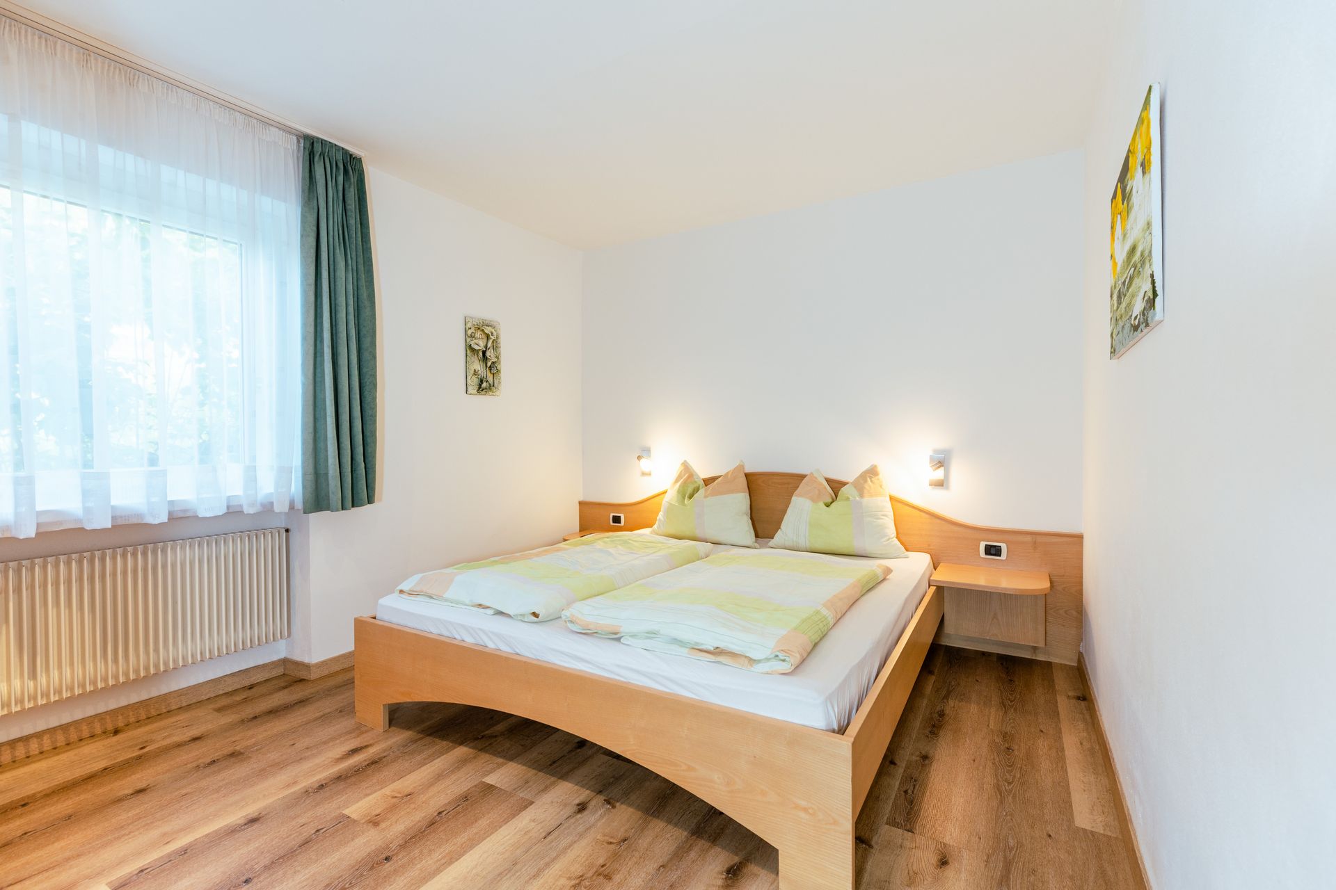 Die Wohnung verfügt über ein Doppelbettzimmer, das mit viel Holz und natürlichen Materialien eine warme, einladende Atmosphäre schafft. Hier finden Sie erholsamen Schlaf nach einem aufregenden Urlaubstag in den Dolomiten. Zudem stehen Ihnen im Wohnzimmer ein Schlafsofa und zwei Badezimmer zur Verfügung – ausgestattet mit: