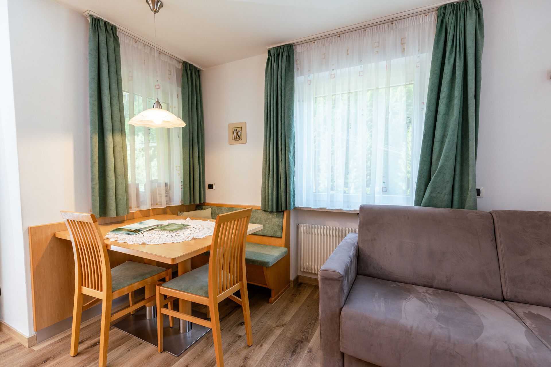Der helle, gemütlich gestaltete Wohnbereich lädt zum Verweilen und Relaxen ein. Eine bequeme Eckbank bietet viel Platz für gesellige Mahlzeiten oder gemütliche Abende. Für Ihre Unterhaltung stehen SAT-TV und kostenloses WLAN zur Verfügung – so bleiben Sie auch im Urlaub bestens verbunden.